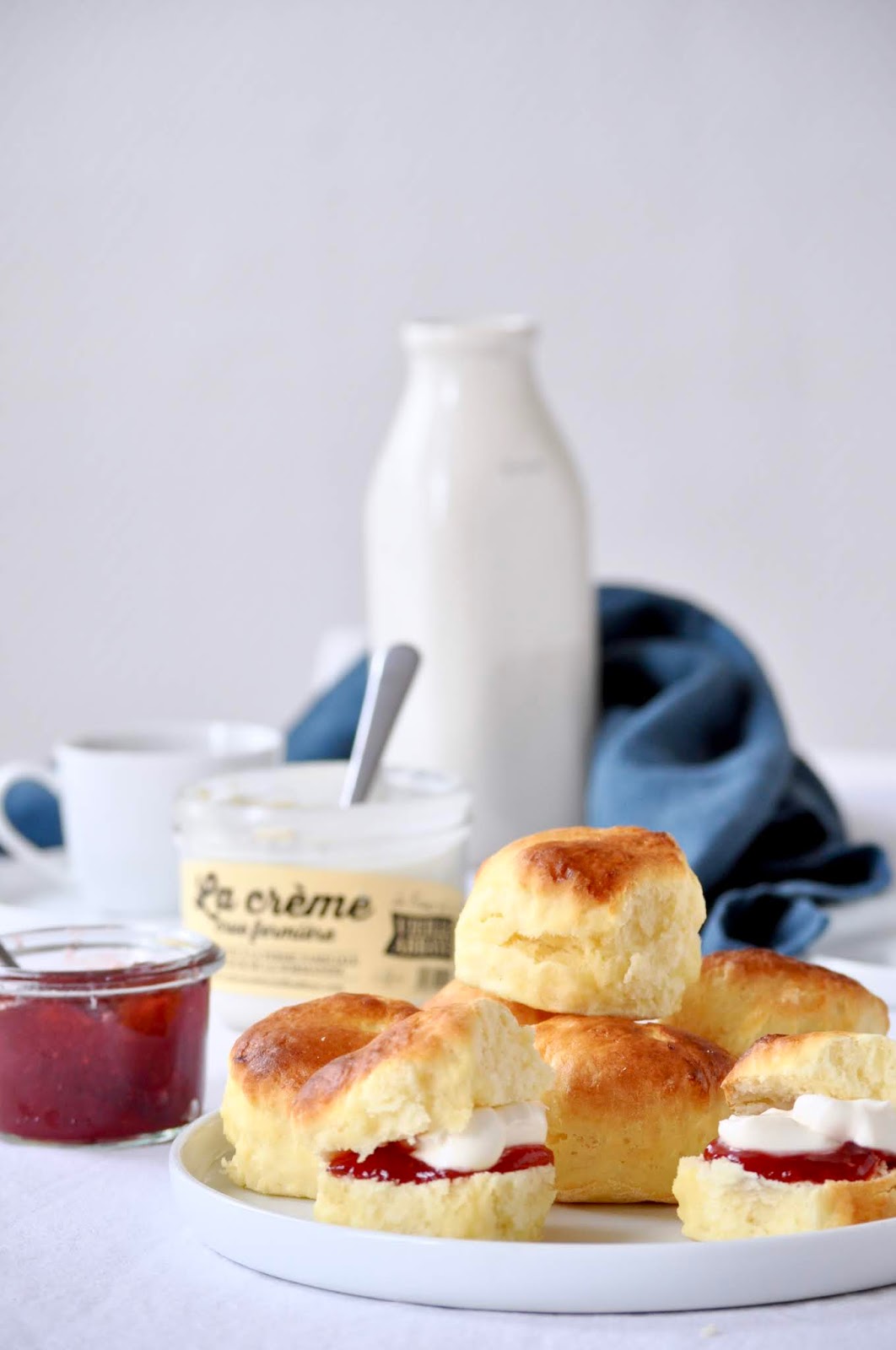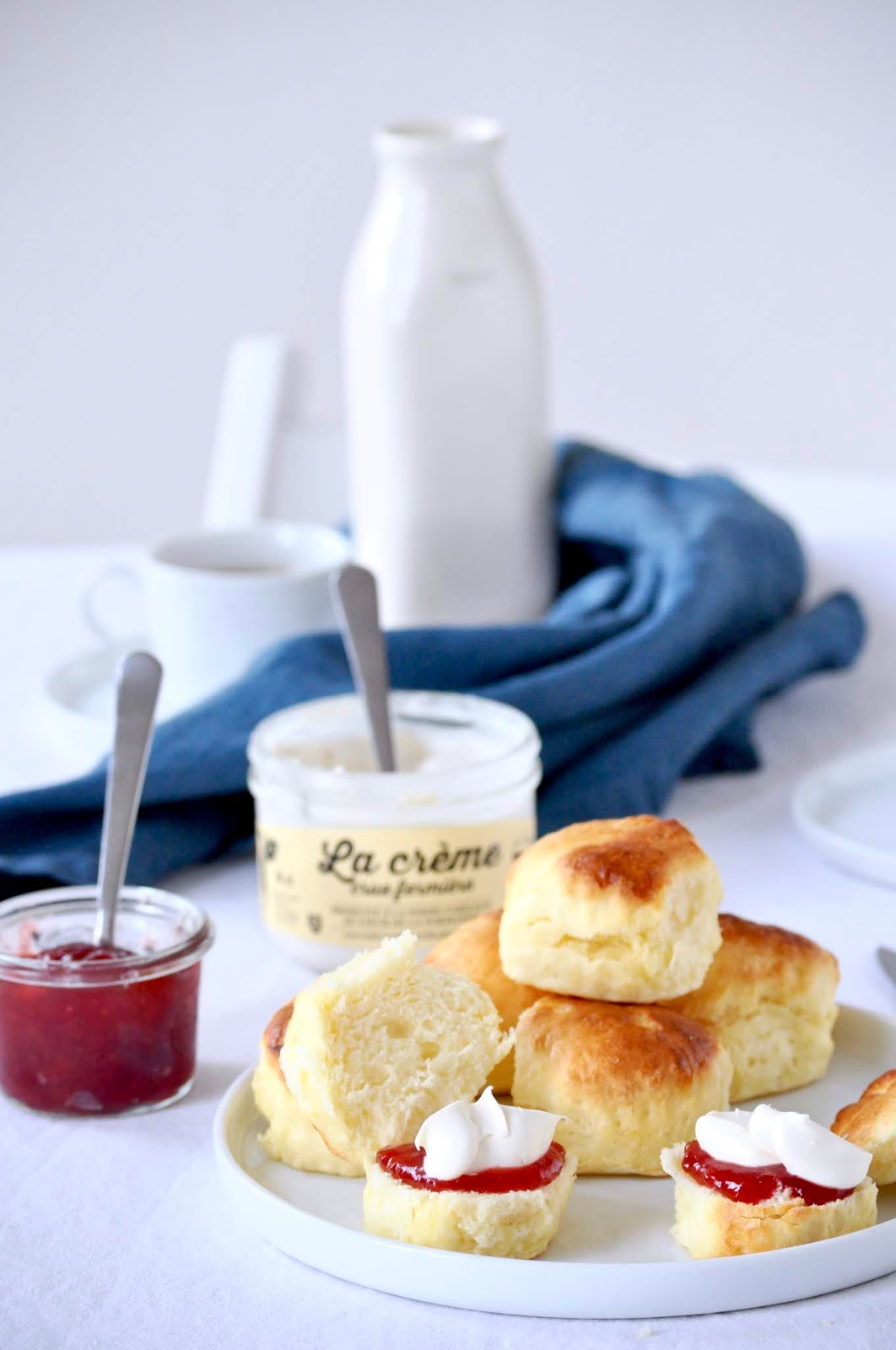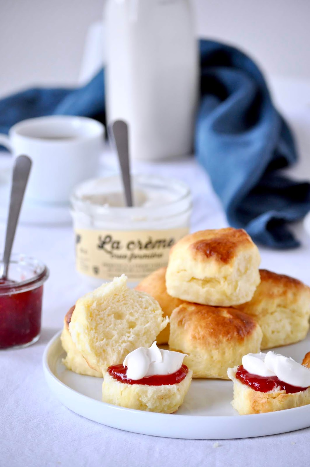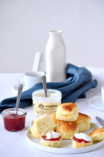 3. Tamisez les farines, la levure, le sel et le bicarbonate ensemble. Incorporez un tiers de ce mélange à la préparation au beurre. Incorporez un peu de lait et de crème. Ajoutez un nouveau tiers de farine, ajoutez le reste de lait et de crème. Terminez par incorporer le dernier tiers de farine.