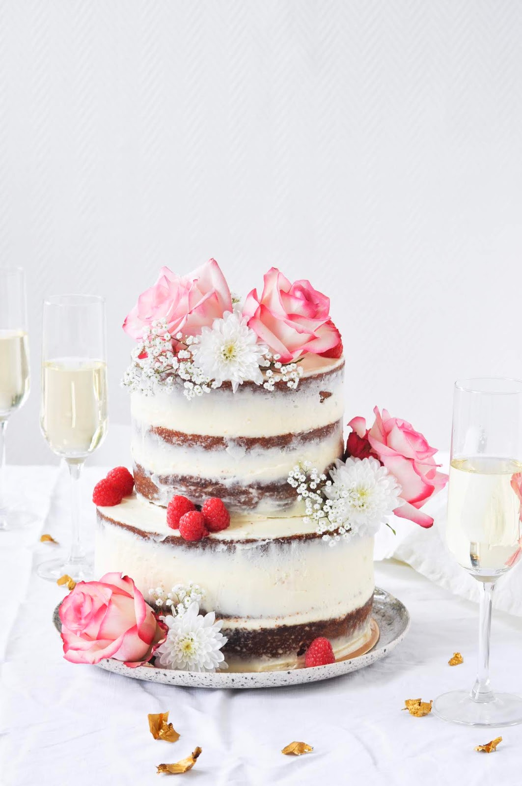 Déposez délicatement le naked cake de 16 cm de diamètre sur celui de 20 cm de diamètre. Décorez de quelques fleurs fraîches non traitées.