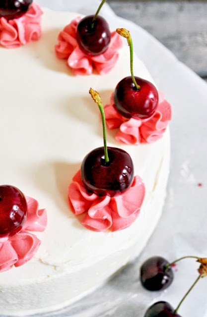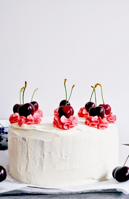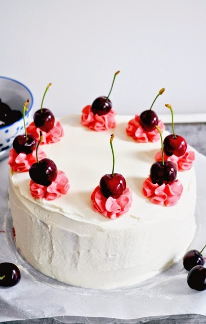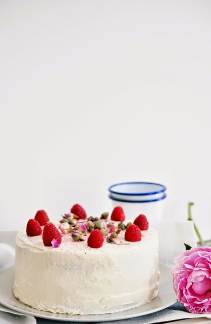 7. Réaliser le glaçage : battre le fromage frais, le sucre glace et le jus de citron ensemble. Répartir le glaçage uniformément et à l'aide d'une spatule sur les génoises montées. Décorer de quelques framboises. Placer au frais avant de servir.