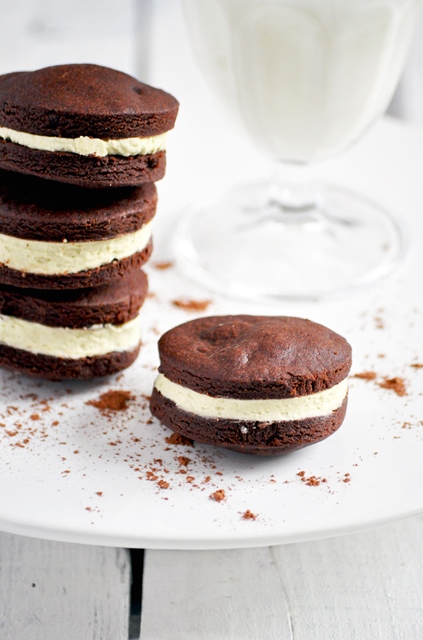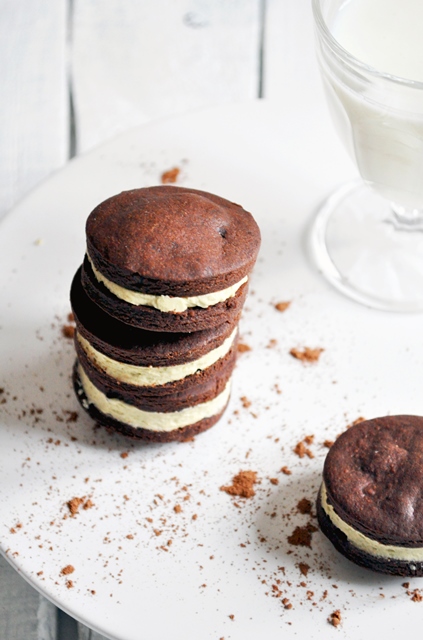 6. Préparer la crème au thé matcha : à l'aide d'un batteur électrique battre ensemble le beurre, le thé matcha, le sucre glace et l'extrait de vanille liquide. Déposer une petite cuillère de cette préparation sur le centre d'un biscuit puis recouvrir d'un deuxième biscuit. Presser légèrement. Continuer ainsi jusqu'à épuisement des biscuits.