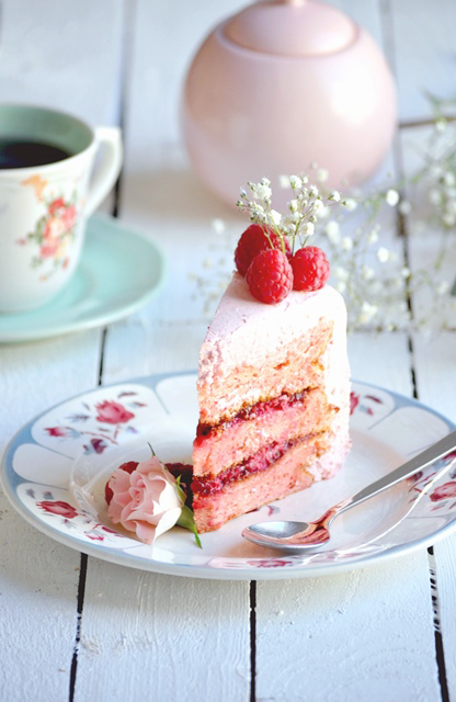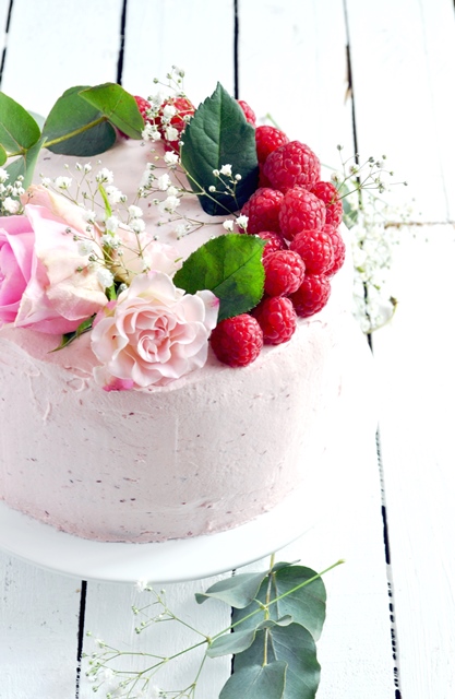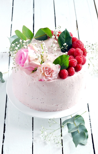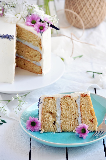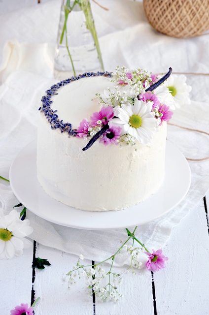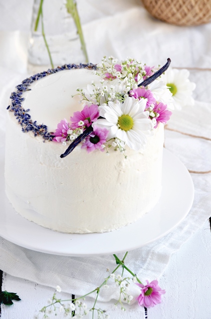 8. Montage : déposer un biscuit sur une assiette étaler la moitié du glaçage au beurre, recouvrir d’un deuxième biscuit et renouveler l’opération. Terminer par le troisième biscuit. Recouvrir, à l’aide d’une spatule, le glaçage sur le pourtour du gâteau. Décorer de fleurs fraîches et de lavande comestible.