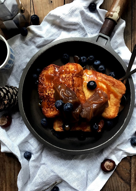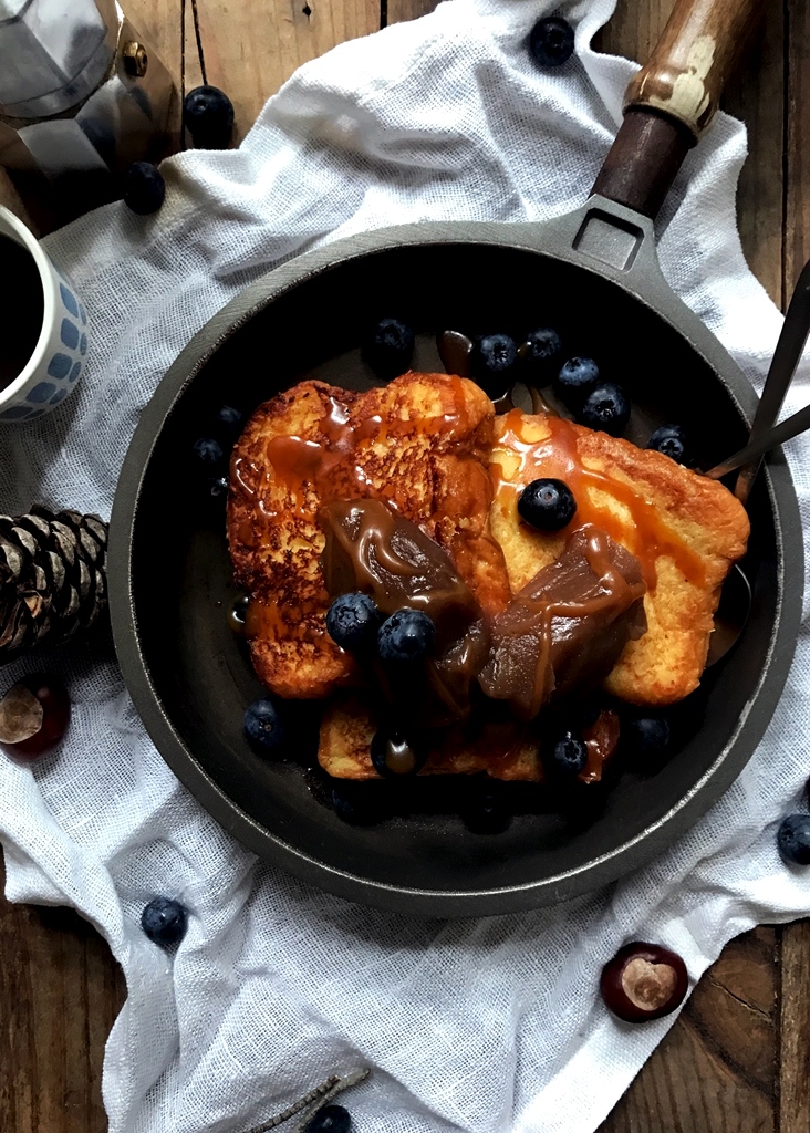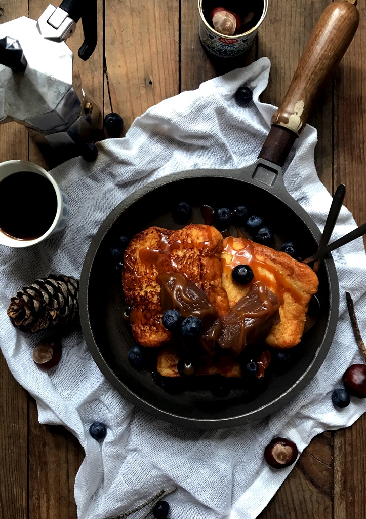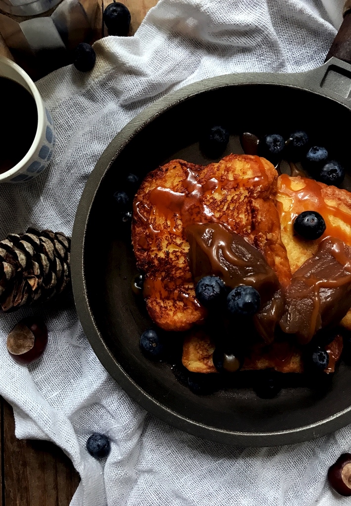 3. Disposer la brioche perdue dans des assiettes et garnir de myrtilles, de crème de marron et de sauce caramel.