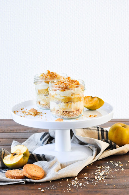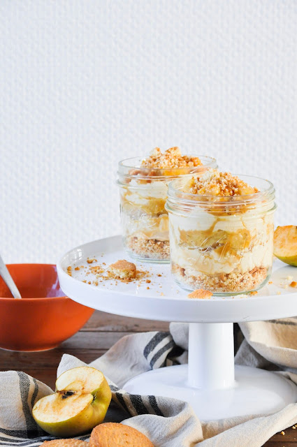 3. Dans le fond de chaque verrine, écraser 3 palets au beurre, ajouter la crème de mascarpone montée avec l'extrait de vanille liquide et les 3/4 de la sauce au caramel. Répartir les pommes uniformément entre chaque verrine, déposer un peu de caramel puis ajouter encore de la crème au mascarpone. Terminer par quelques pommes et des biscuits émiettés.