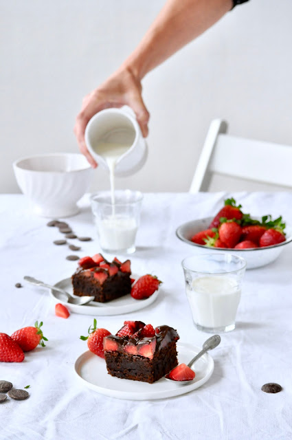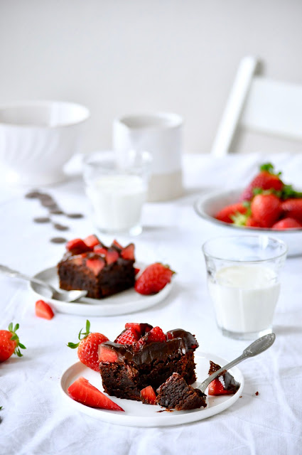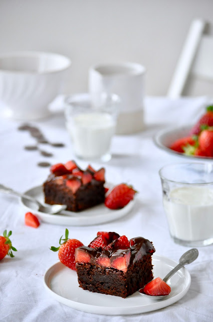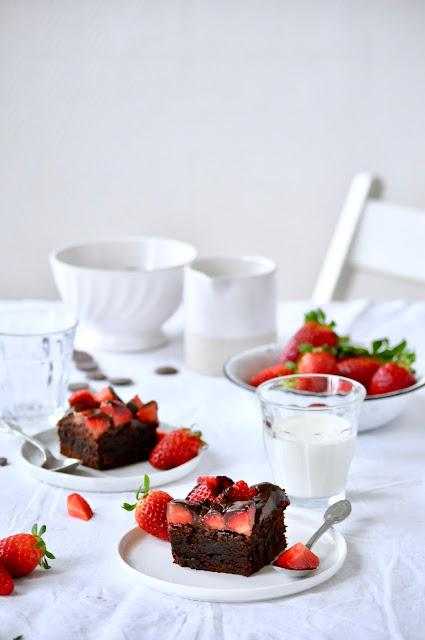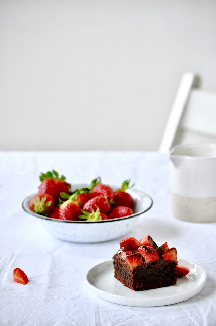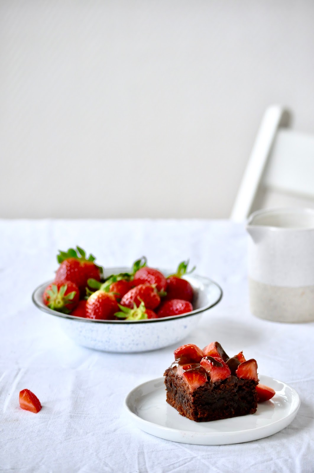 Cependant, j'ai conservé quelques pulls, à la bonne heure ! A mon grand désarroi, ils seront encore utiles. J'enfile un jean, un haut à pois et je file en cuisine. les robes attendront, les gâteaux, eux, sont de toutes les saisons. Que faire justement, quand les saisons s'affolent ? Mélanger les genres, oser, marier les saveurs et les couleurs. Subtil jeu des textures et des goûts. C'est décidé : quelques fraises, du chocolat, une recette indémodable de brownie et je devrais trouver à me consoler de ce soleil qui semble être si timide en ce mois d'avril.